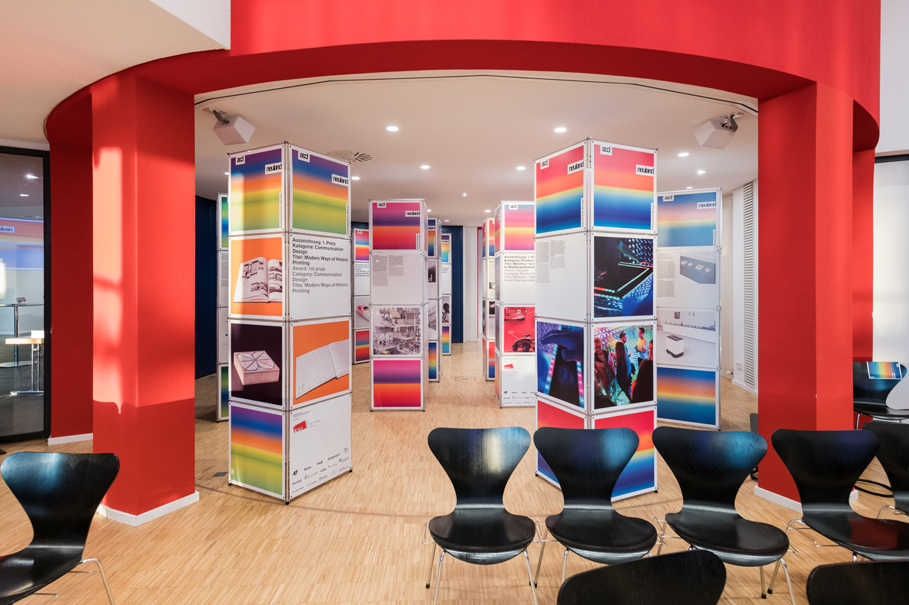 Für diese Wanderausstellung biete sich clic ideal an. Auf vierzehn Türmen von je 60 x 60 x 240 cm können die ausgezeichneten Arbeiten und die Informationen zum Wettbewerb auf bedruckten Panels hervorragend präsentiert werden.