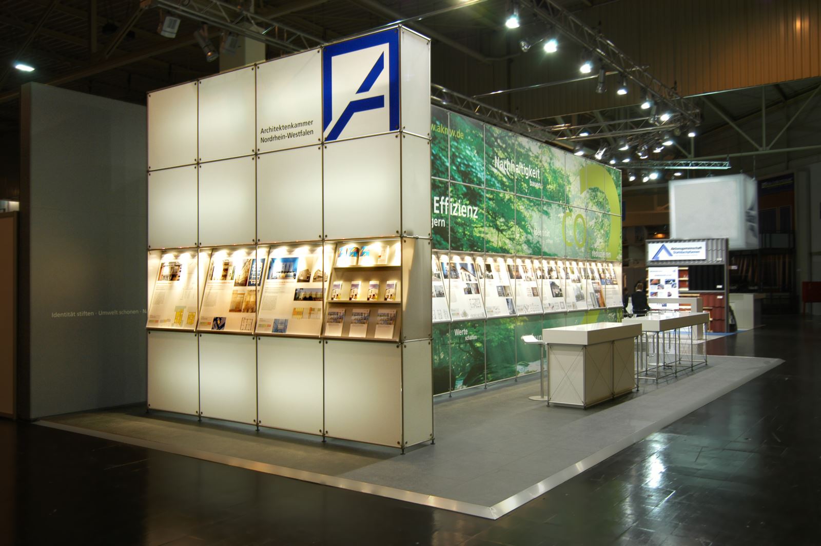 Im Rahmen eines Wettbewerbes gewann die D’Art Design Gruppe aus Neuss die Realisierung des neuen Auftrittes der AKNW. Trägermaterial für diesen äußerst variablen Stand ist das Architektursystem pon. Großes grafische Flächen geben dem 78 m² Stand einen unverwechselbaren Auftritt. Realisierung einschließlich Sondermöbelbau kam durch Schirwon Messekonzepte mit Format aus Köln.