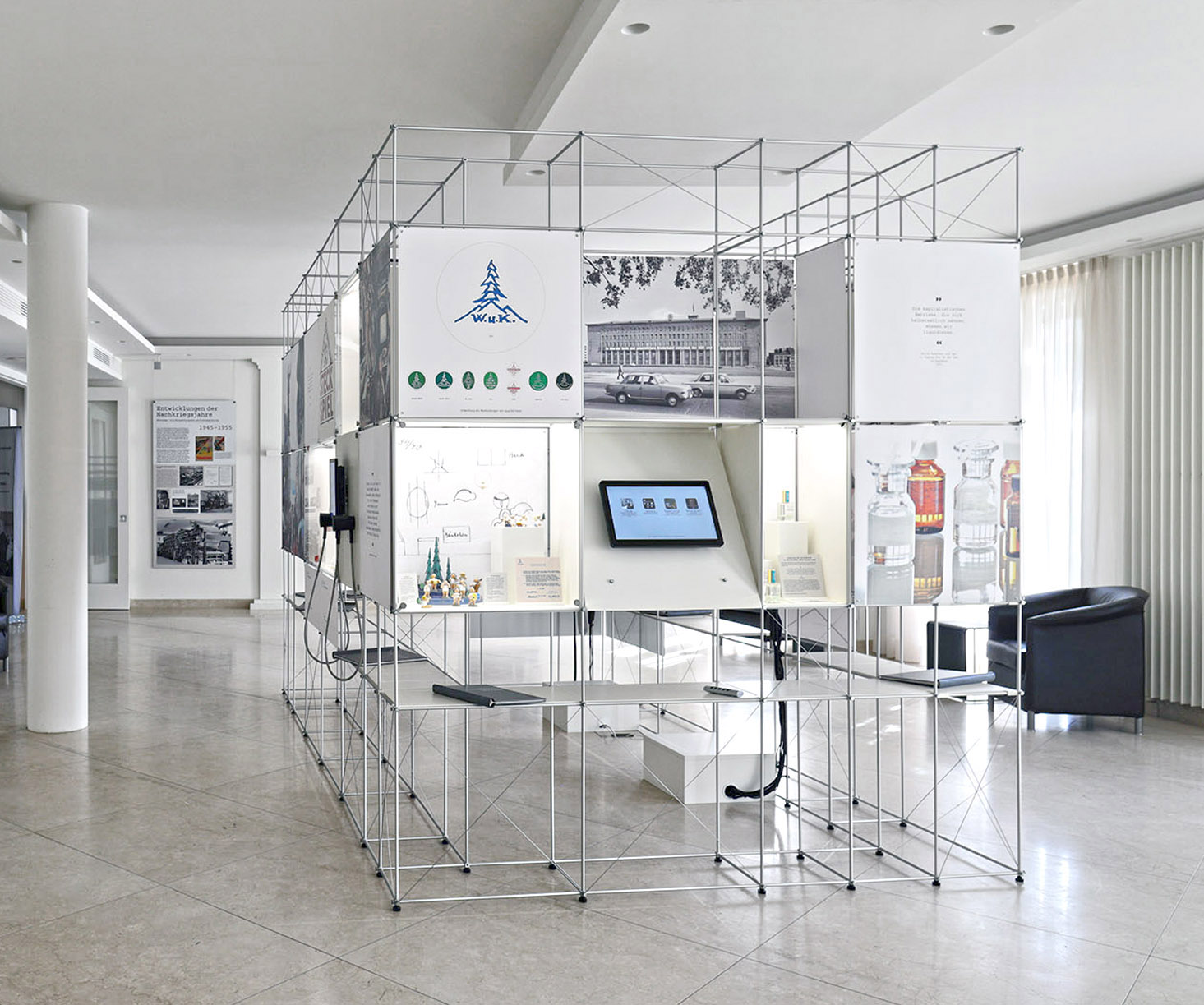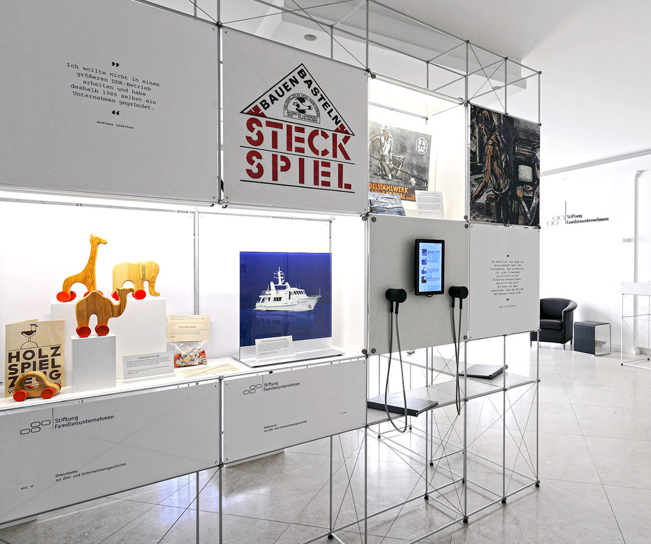 Im "Haus des Familienunternehmens" zeigt die Stiftung Familienunternehmen die Ausstellung "Verdrängung, Enteignung, Neuanfang - Familienunternehmen in Ostdeutschland von 1945 bis heute". Agentur ML fotografie & design aus Berlin verantwortet die Gestaltung und hat sich hier für das flexible und langlebige Raumsystem clic von Burkhardt Leitner entschieden.