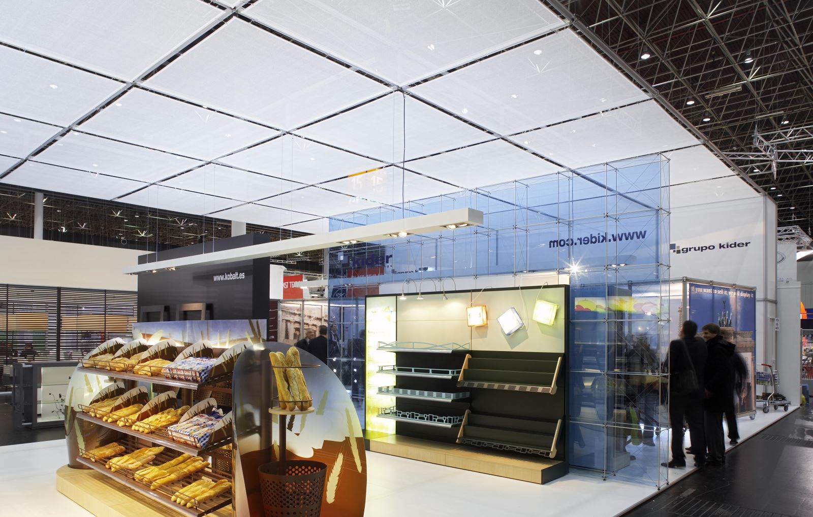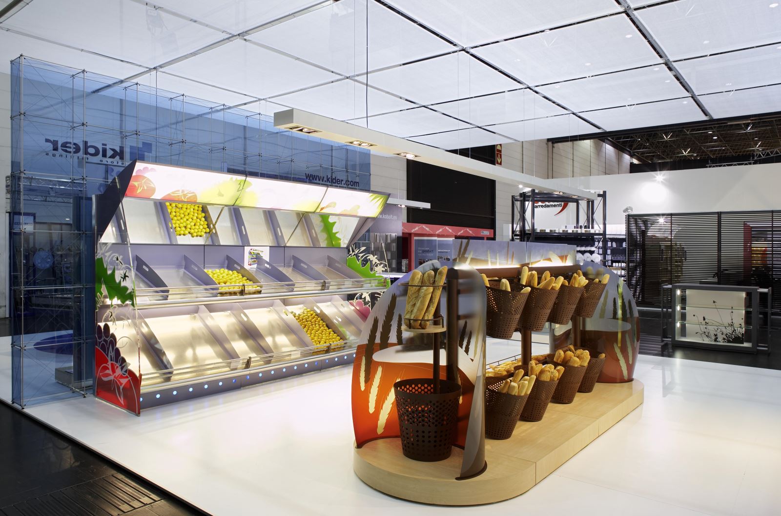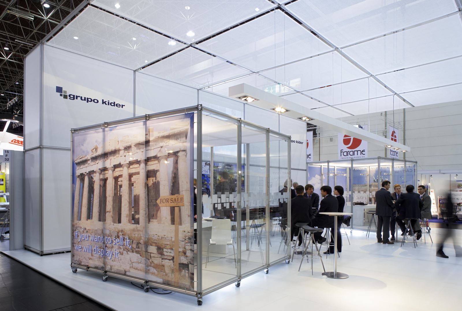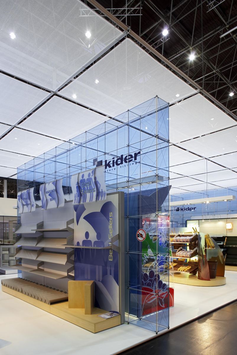 Unter der 30m langen abgehängten Deckenkonstruktion aus pila petite stellte die Firma Kider S.A. ihr Shop-Mobiliar und ihre Shop-Ausstattungslösungen vor. Die drei Meter hohen fast transparenten clic-Wände dienten als Rückwand für die Shop-Regale. Der zentrale Besprechungsbereich bestand aus 13m² großen Besprechungskuben auf Rollen mit Textilbespannung, realisiert mit dem System pila petite.