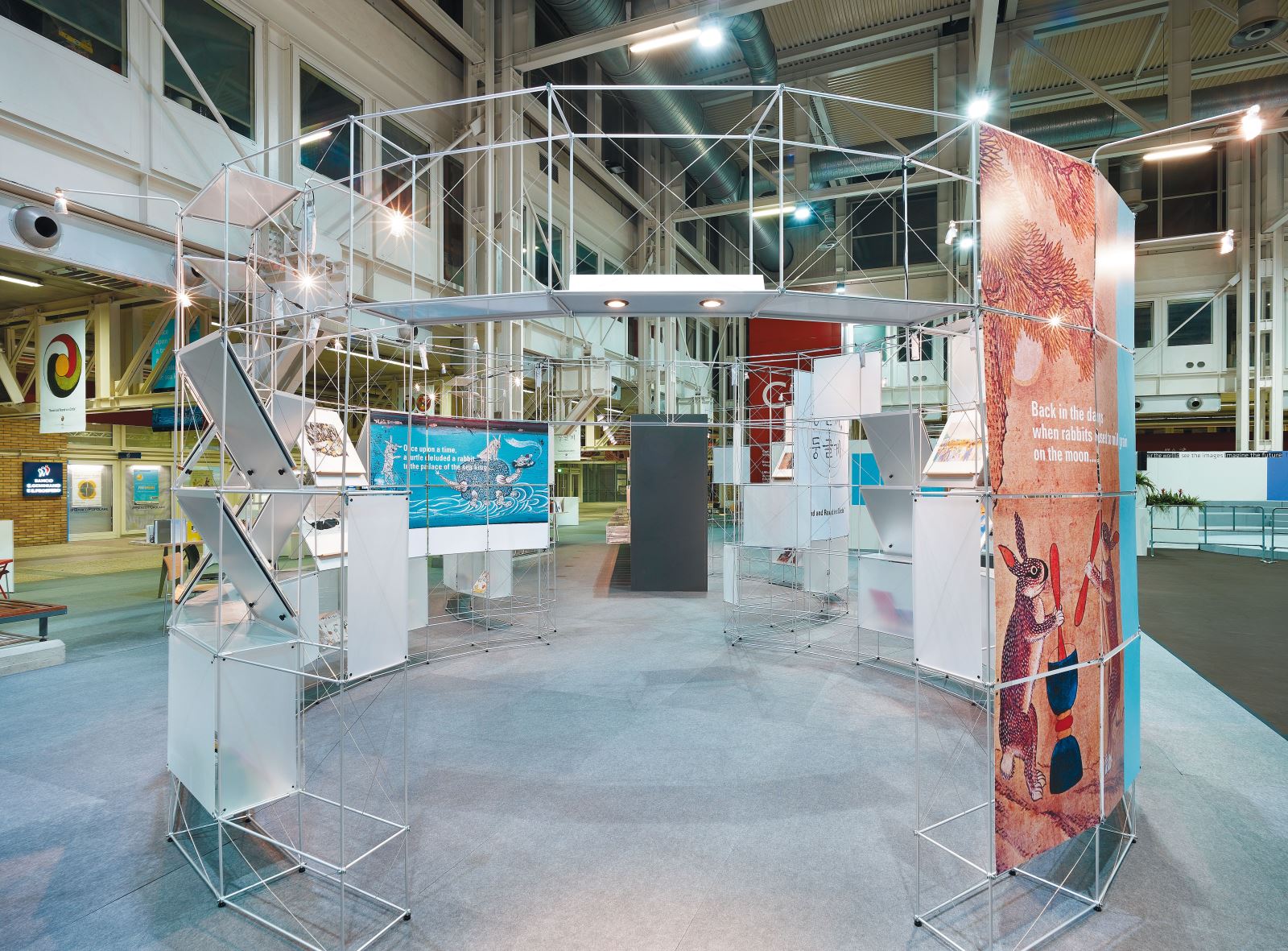 Dieses Konzept kam erstmals auf der Kinderbuchmesse 2009 in Bologna zum Einsatz. Gemeinsam mit unserem Partner Design IGA² bespielten wir die Fläche des diesjährigen Gastlandes Südkorea mit einer Installation aus clic round und einem Rückzugsraum aus dem System pon office.