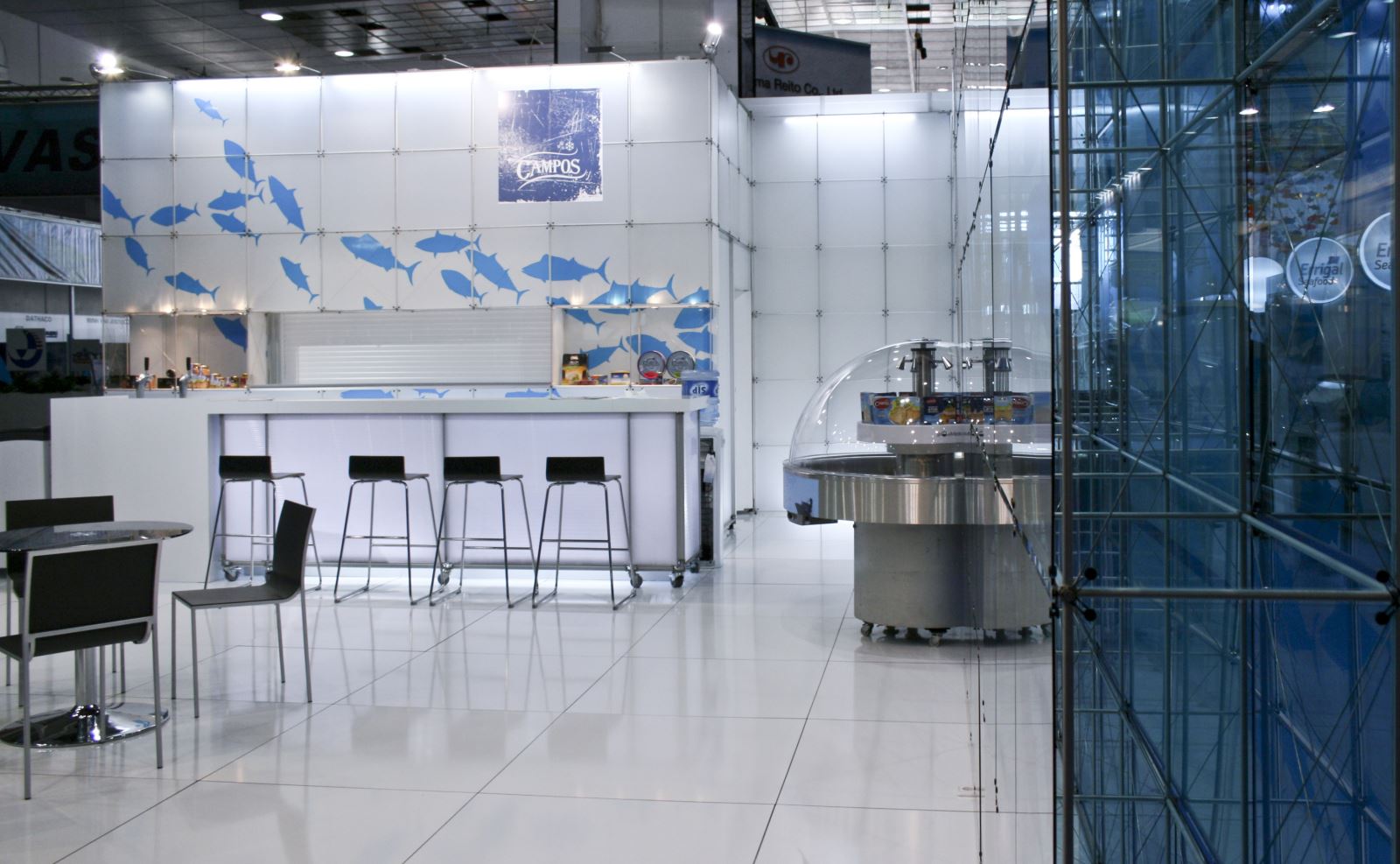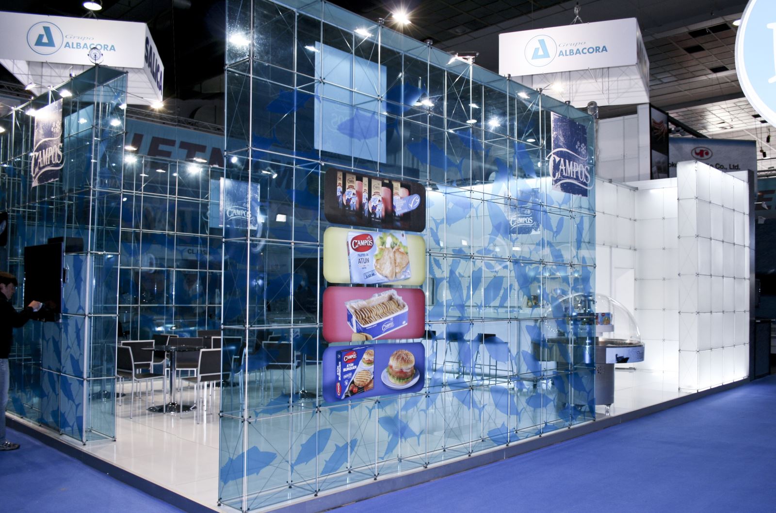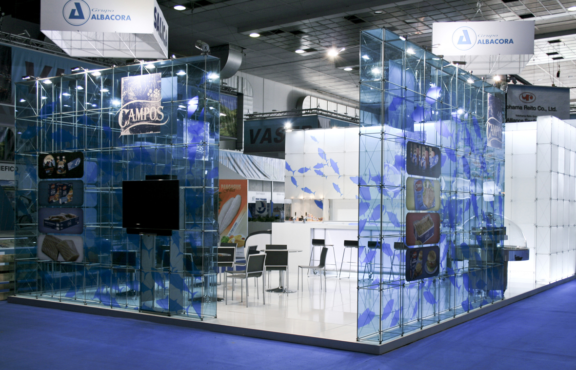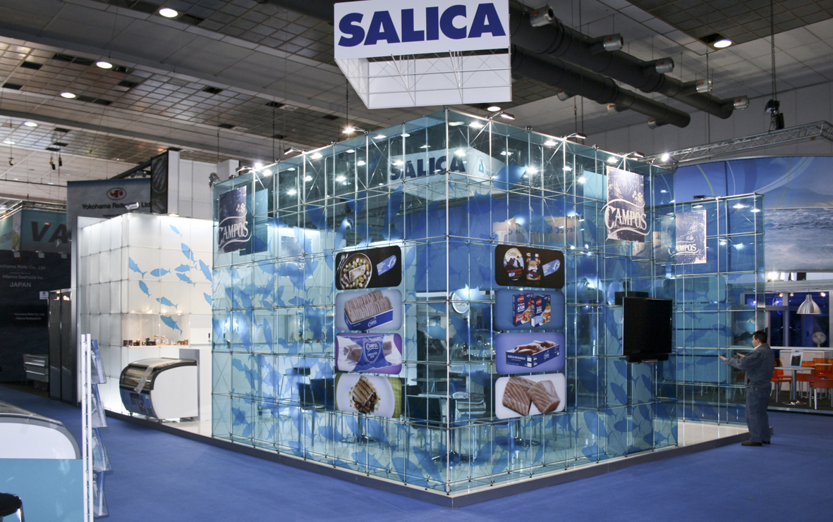 ...Gestaltete unser Partner Arista diseño mit dem System clic einen transparenten Messestand mit blauem, transluzenten Plexiglas und transparenten Vinylaufklebern in Form von Fischen. Von außen wie von innen weckt der Stand Assoziationen an die Tiefen des Meeres und schafft so eine differenzierte, aussagekräftige Wirkung. Neben dem Auftritt auf der Feria Conxemar in Vigo, Spanien, war der Stand, der dort auf Grund seines hohen Innovationsgrads und seiner Präsenz große Akzeptanz erfuhr, auch auf der European Seafood Exposition in Brüssel zu sehen.