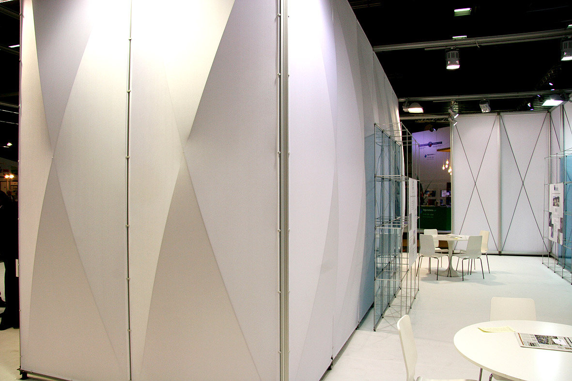 The basic structure consisted of a pila petite design, accentuated by curved textile surfaces. Inside, clic screens displayed information about the firm’s products.