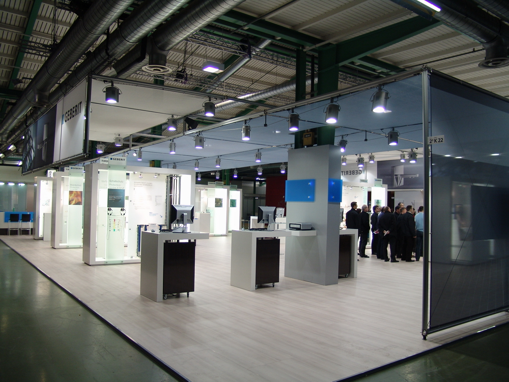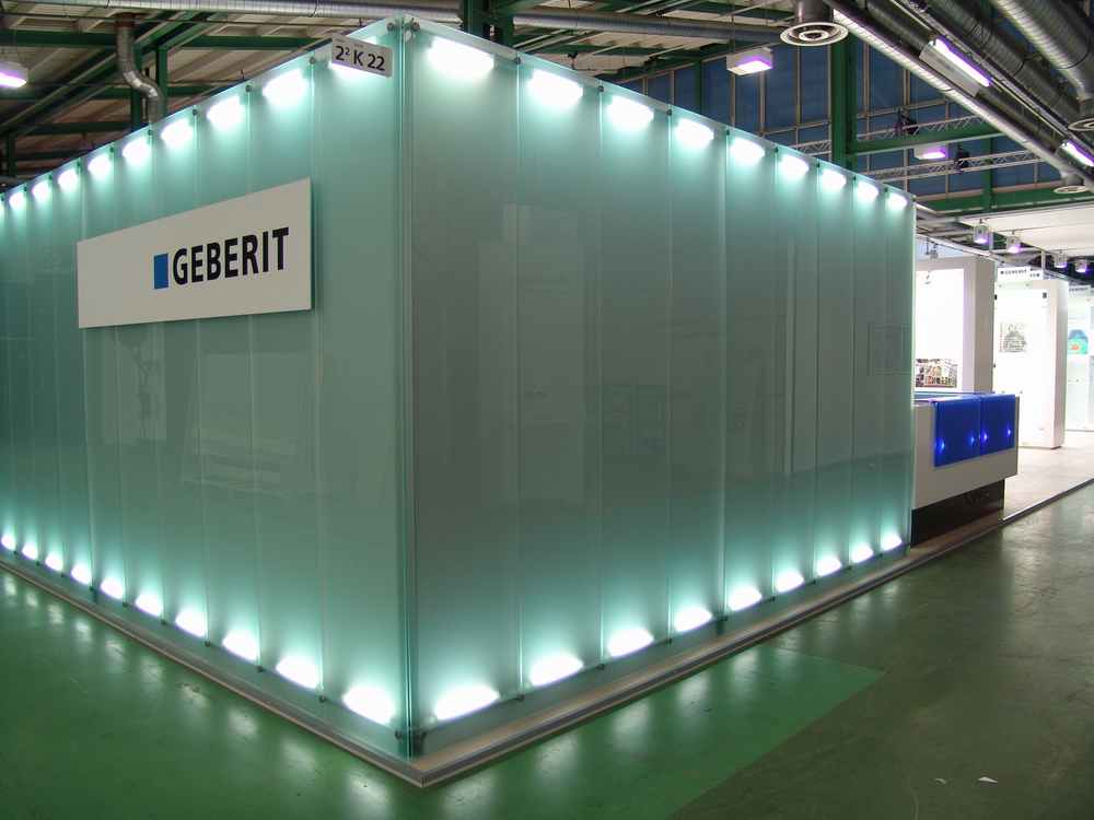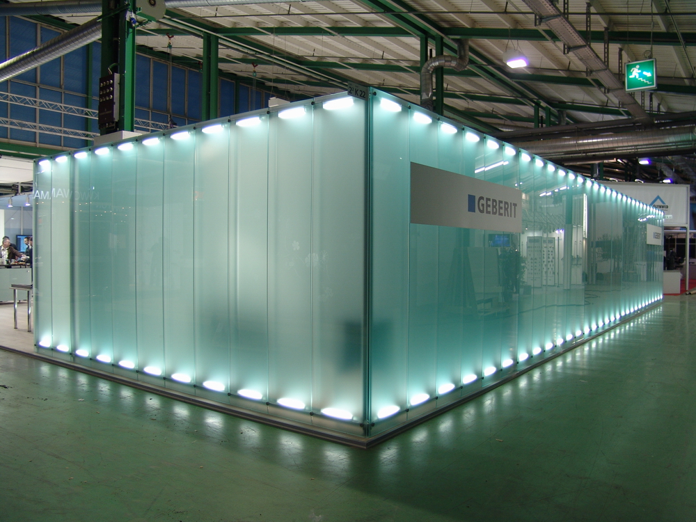 For their stand at Swissbau 2007 in Basel, Grigat and Neu designed a trade fair stand using the system pila petite: Two graceful pila petite frames as ceiling construction – visually homogenous with a covered structure – create the space. Large-format wall elements also of pila petite with vertical facing and illuminated glass elements form an exciting contrast to conventionally set up furniture and presentation elements.