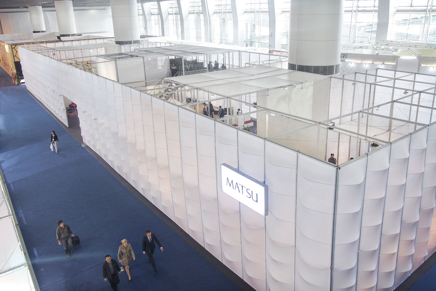 The outer wall was made out of pila petite, reminiscent of the Water Cube from the Beijing Olympics. The system enclosed the whole stand – with a total size of 700 m² – as a transparent and elastic curve skin. Taking a look inside the stand, one part was made out of pila Doppelstock. For the reception area as well as the furniture inside the stand Matsu used pon office.