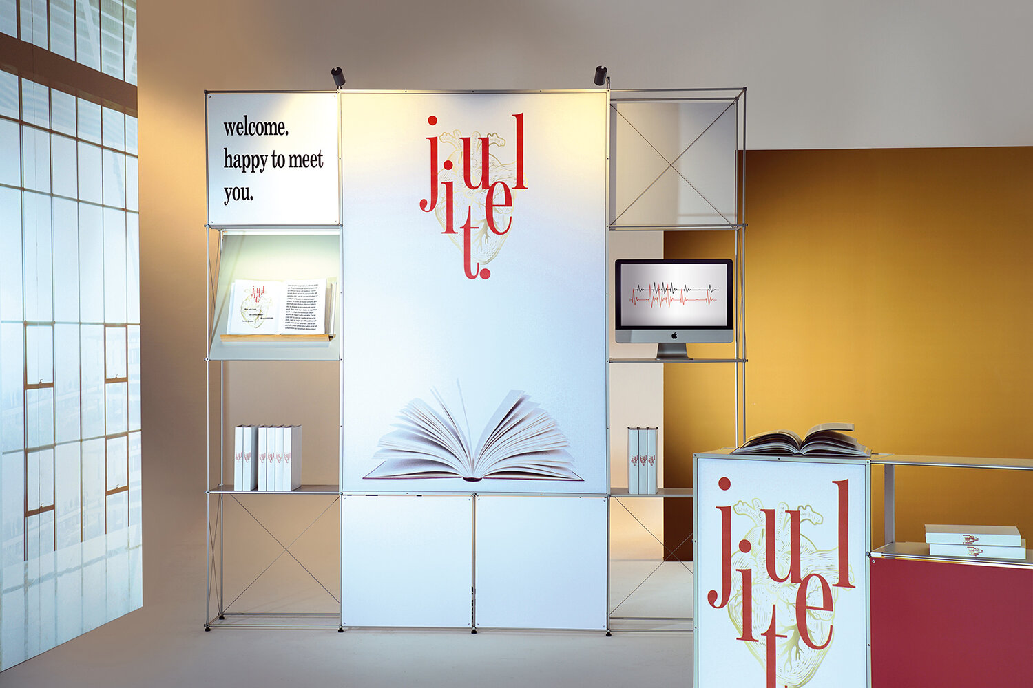 The clic up unit JULIET allows you to use it for a wide variety of events and exhibition situations - whether it is used with many products or with digital media - A high-quality slanted shelf additionally supports the presentation of your information material.
