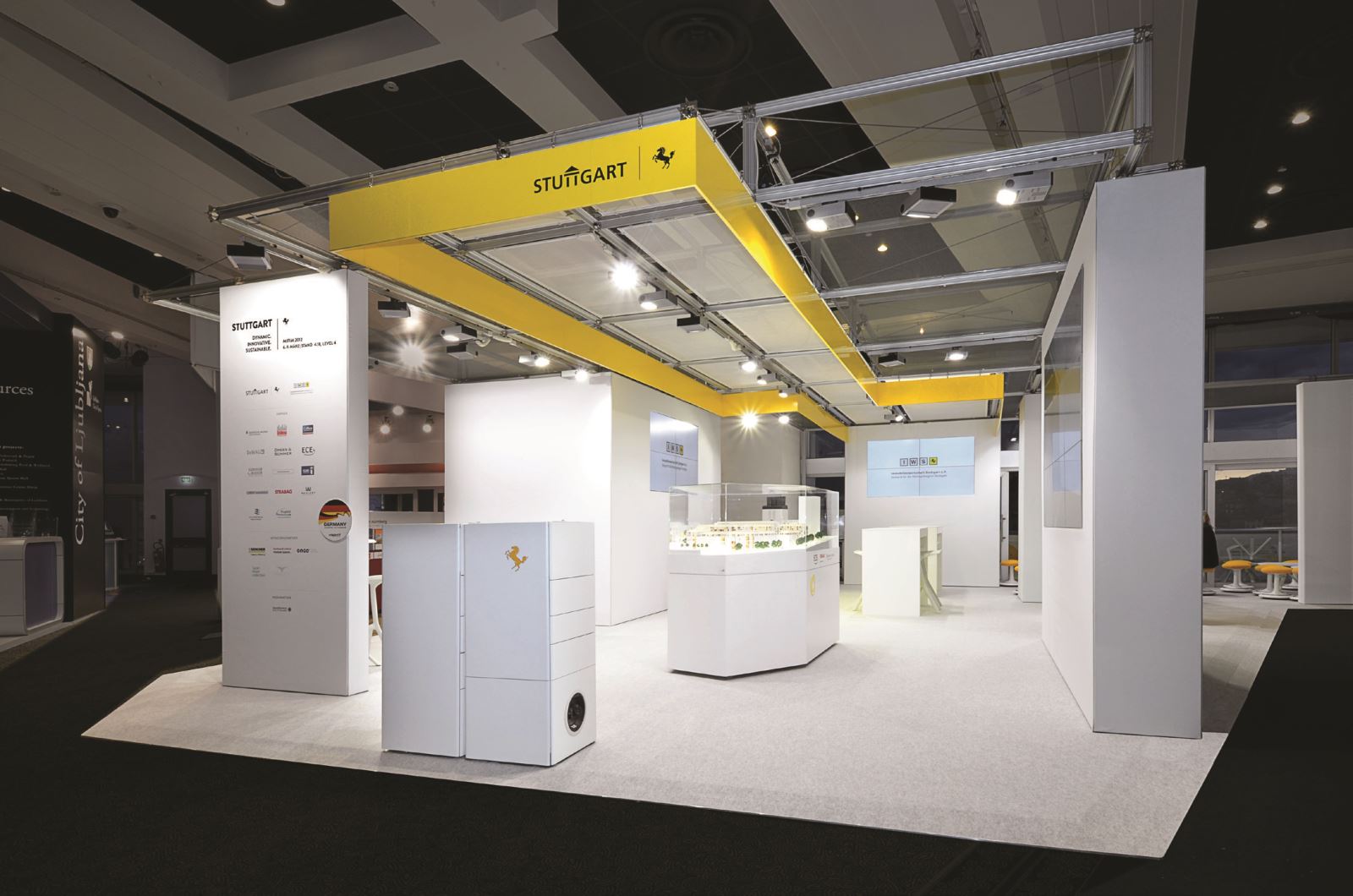 Even the fair appearance of the joint stand has done this slogan justice. The architecture system pila petite was the ideal partner for the paperless stand. Printed canvases, built-in monitors, a clear design and a good architecture floor plan have shown pila petite from its best side.